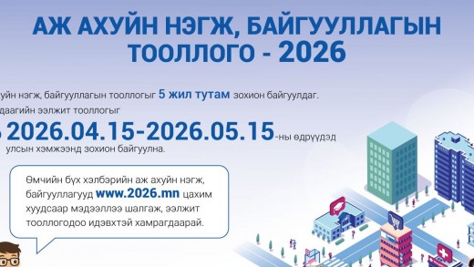 Аж ахуйн нэгж, байгууллагын 2026 оны тооллого улсын хэмжээнд бүртгэлд суурилсан аргаар буюу төрийн байгууллагуудад бүртгэлтэй мэдээлэлд үндэслэн зохион байгуулж байна. Тооллого ирэх сарын 15-ны өдөр х…
