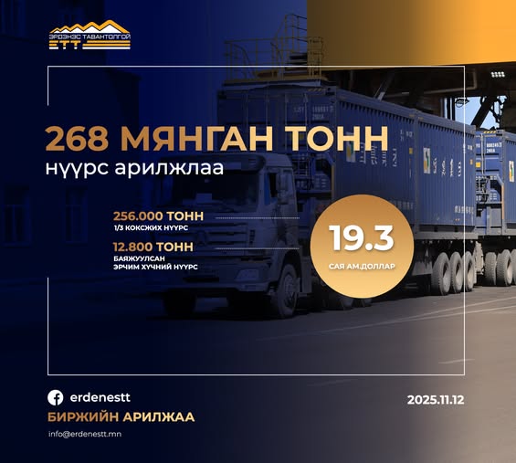 “Эрдэнэс Тавантолгой” ХК 2025 оны 11 дүгээр сарын 12-ны өдөр Монголын Хөрөнгийн Биржээр дамжуулан 2 удаагийн арилжаа хийж 19.3 сая ам.долларын үнийн дүн бүхий 268.8 мянган тонн нүүрс БНХАУ-ын Мандал боомт хүргэж өгөх нөхцөлөөр амжилттай арилжааллаа.