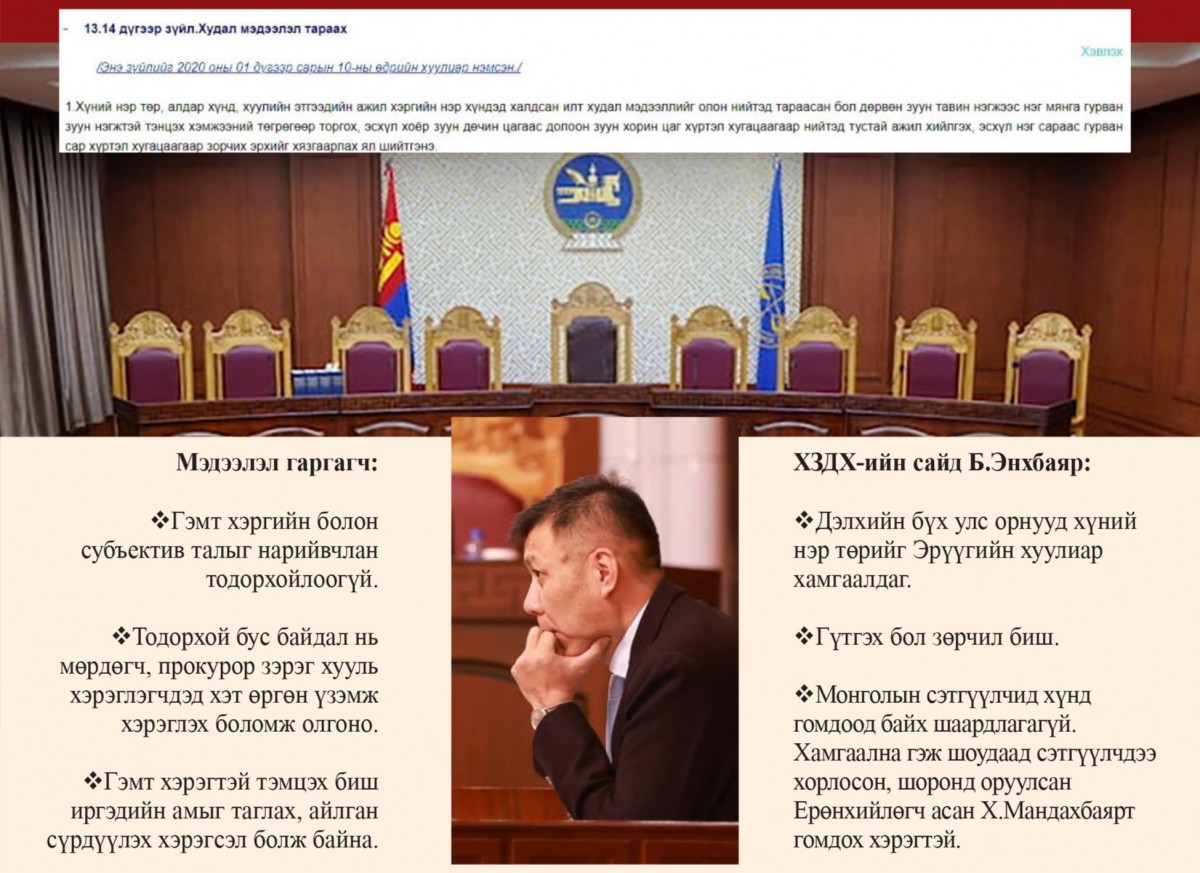 Үндсэн хуулийн Цэцийн дунд суудлын хуралдаан өчигдөр эхэллээ. Хуралдаанаар Эрүүгийн хуулийн 13.14 дэх заалт буюу "илт худал мэдээлэл тараах" нь Үндсэн хууль зөрчсөн эсэх маргааныг хэлэлцэж байна. Хуралдаан өнөөдөр үргэлжилж шийдвэрээ танилцуулна. УИХ дахь намын бүлгүүд өчигдөр хуваарийн дагуу хуралдаж, зарим асуудлыг хэлэлцэн байр сууриа нэгтгэжээ. Ардчилсан намын бүлгийн хурлаар хоёр асуудал хэлэлцжээ. Тамхины хяналтын тухай хуульд нэмэлт, өөрчлөлт оруулах тухай хуулийн төсөлд хийсэн дүн шинжилгээний танилцуулга мэдээллийг УИХ дахь Ардчилсан намын бүлгийн ахлах зөвлөх М.Чимэддорж гишүүдэд танилцуулсан бол Улсын хэмжээнд татварын орлогын гүйцэтгэл, татварын өртэй аж ахуйн нэгжүүдтэй холбоотой Татварын Ерөнхий газрын бэлтгэсэн мэдээллийг сонсжээ. Улсын төсөвт төвлөрөх ёстой 6.5 их наядын өр байгаа бөгөөд үүнээс 74.389 компани 6.2 их наядын өртэй байгаа талаар мэдээлэл өгсөн зэрэг багтаж байна.