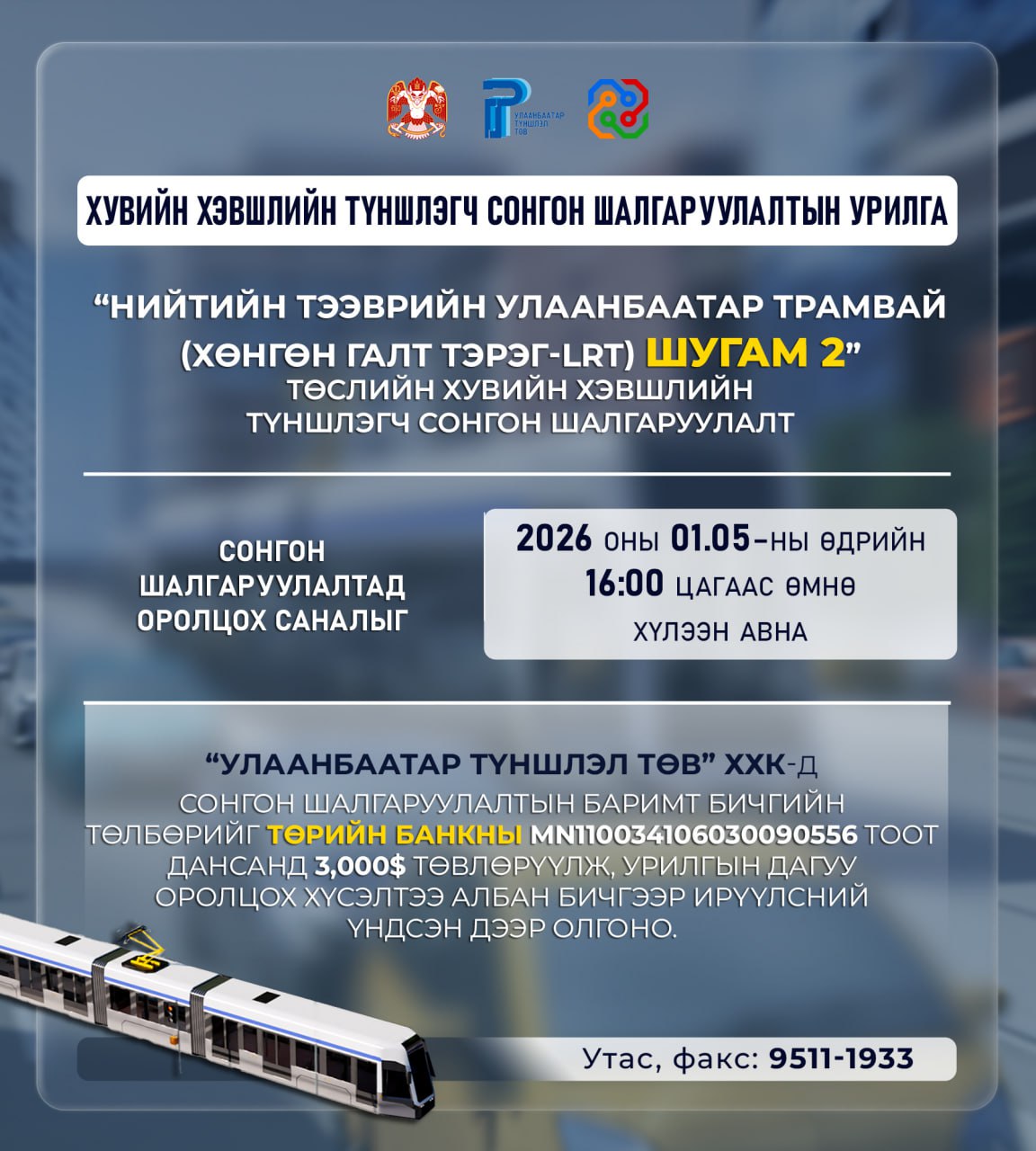 Нийслэлийн Засаг даргын Тамгын газар нь “Нийтийн тээврийн Улаанбаатар трамвай (Хөнгөн галт тэрэг-LRT) шугам-1” төслийн зураг төсөл, төсвийг боловсруулах, барих, ашиглах, шилжүүлэх хэлбэрээр түншлэлийн гэрээ байгуулах хувийн хэвшлийн түншлэгчийг сонгон шалгаруулалтад урьж байна.