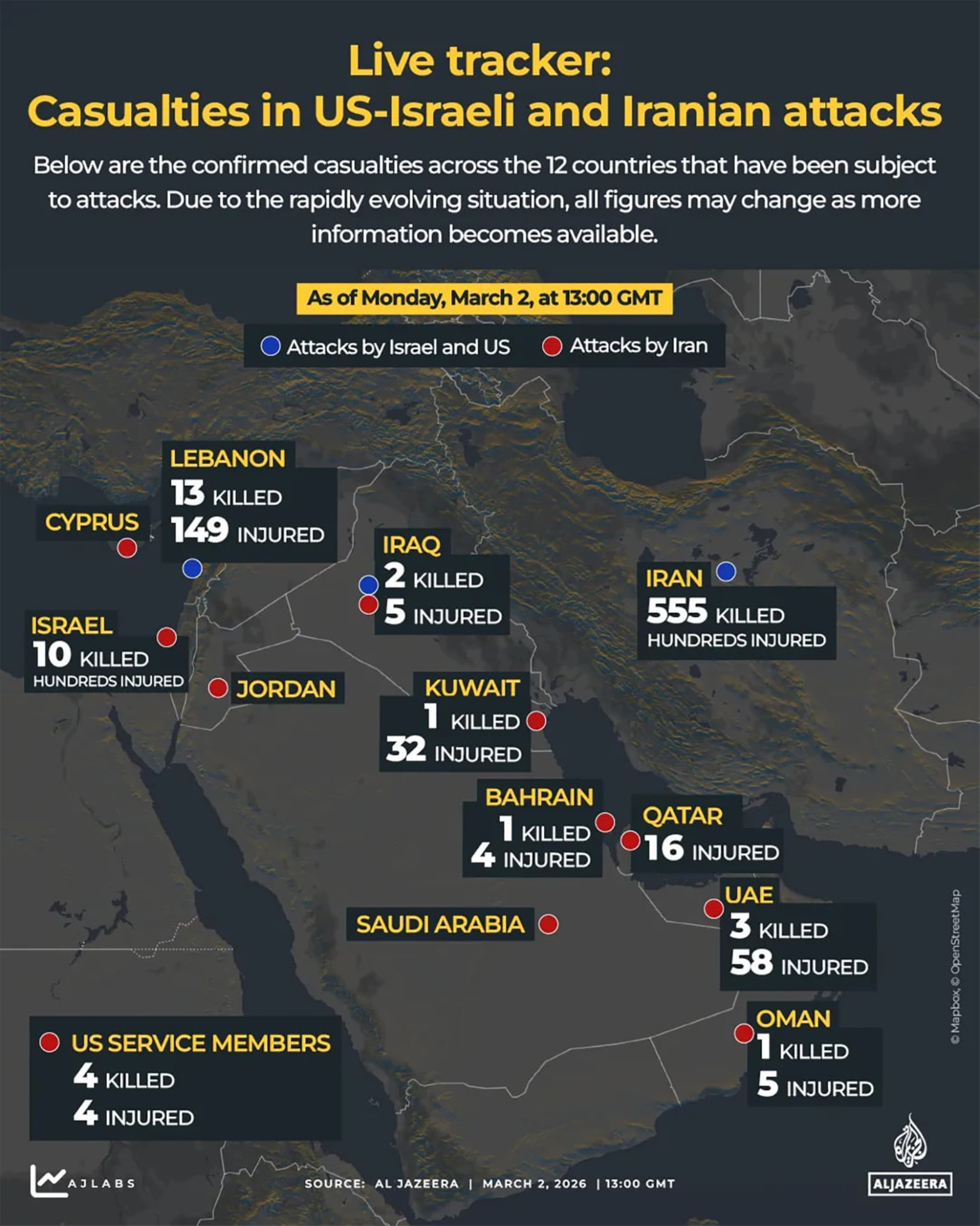 Ираны Хувьсгалын харуулын корпусаас Ормузын хоолойг хааж, энэ чиглэлд дамжин өнгөрөхийг завдсан ямар ч хөлгийг устгана гэж мэдэгдлээ. АНУ болон Израилийн агаарын довтолгоо эхэлснээс хойш Иран даяар дор хаяж 555 хүн нас барсан гэж Iranian Red Crescent Society мэдээлсэн байна. Нас барсан иргэдийн дотор дээр дурдсан өндөр албан тушаалтнуудаас гадна гэмгүй иргэд тэр дундаа Ираны Өмнөд хэсгийн Хормозган мужийн Миноб хотын охидын сургуульд бөмбөг дэлбэрснээс 165 хүн амиа алдсаны ихэнх нь хүүхдүүд, багш нар байжээ. Мөн харилцан гал нээж байгаагаас Иран шиг олноор бус ч хохирол амссан улс орнуудын тоо нэмэгдсээр байна. Тухайлбал, Катарт 16 хүн гэмтэж, Арабын Нэгдсэн эмират улсад гурван хүн амиа алдаж, 58 хүн шархадсан бол АНУ-ын хувьд дөрвөн албан хаагч амь насаа алдаж, дөрвөн хүн шархадсан. Лебанондд 13 хүн амиа алдаж, 149 хүн шархадсан бол Израйльд 10 хүн алагдаж, олон зуун иргэд гэмтэж бэртжээ.