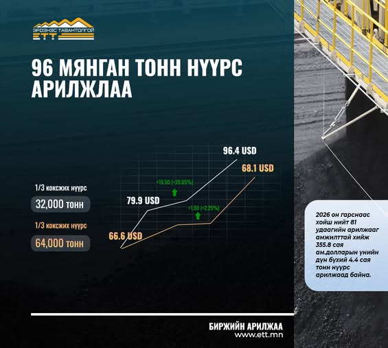 2026 онд 81 удаагийн арилжаагаар 355.8 сая ам.долларын үнийн дүн бүхий 4.4 сая тонн нүүрс арилжлаа.